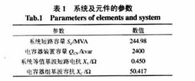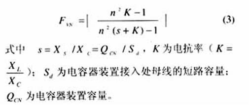 當式(2)諧波阻抗的分母的數(shù)值等于零時,即從諧波源看入的阻抗為∞,表示電容器裝置與電網(wǎng)在第n次諧波發(fā)生并聯(lián)諧振,并可推導出電容器裝置的諧振容量QCX[4]為